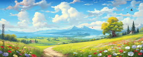 © Michal, Fototapeta premium Summer landscape with bicycle and meadows full of flowers. Holiday sunshine banner.