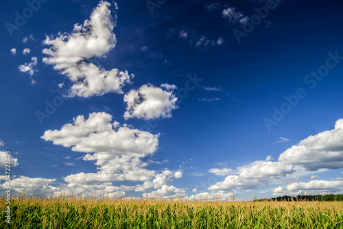 Fototapeta premium Summer landscape with blue sky and white clouds over the corn field..