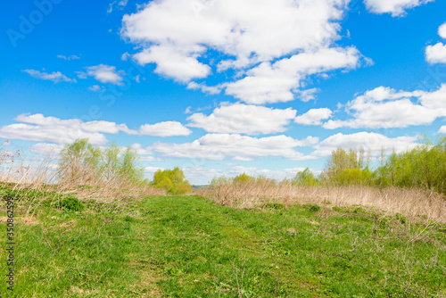 Obraz premium Summer landscape with green and dry grass and a blue sky with clouds