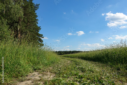 Fototapeta premium Summer landscape with green grass, road and clouds