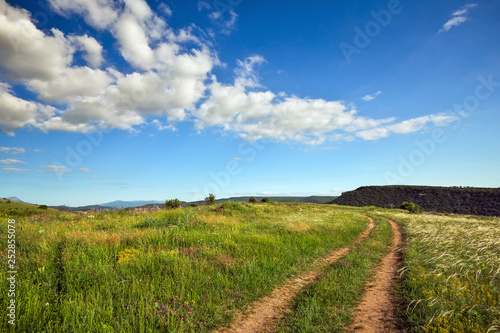 © es0lex, Obraz premium Summer landscape with green grass, road and trees