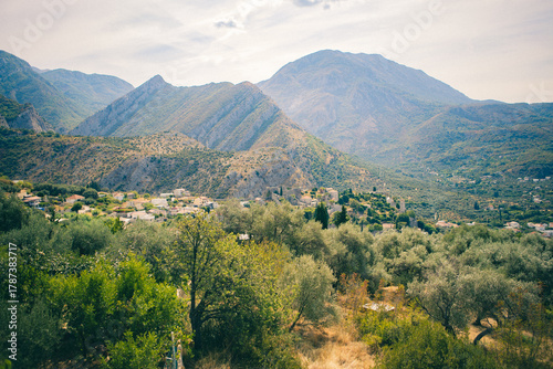 Naklejka premium Summer Landscape with Mountains and View of Village and Olive Grove
