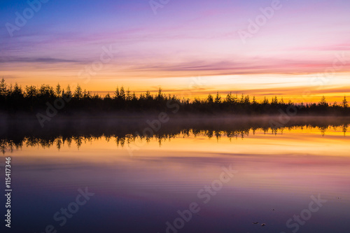 © Olonkho, Fototapeta premium Summer landscape with river and sunset and cloudy sky