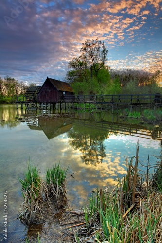 Fototapeta premium Summer landscape with river and watermill