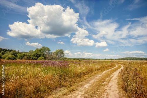 © Dmitry, Fototapeta premium summer landscape with the road through beautiful meadows
