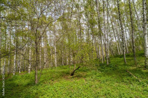 Fototapeta premium Summer landscape with views of the lawn near the birch grove