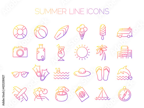 Fototapeta premium Summer line icons isolated on white. Set of sea holidays vector icons with gradient.