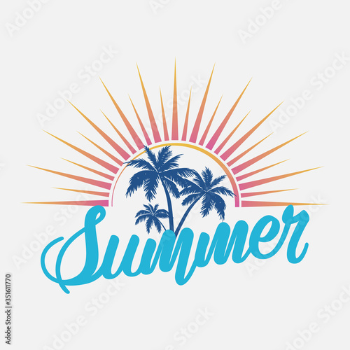 © logonansy, Naklejka premium Summer logo template with hand lettering, emblem, sticker, badge. Summer illustration with the sun and palm trees.