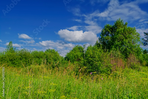 Obraz premium Summer meadow landscape with green grass and wild flowers.