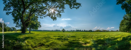 © MD, Fototapeta premium Summer Meadow Landscape with Trees and Blue Sky