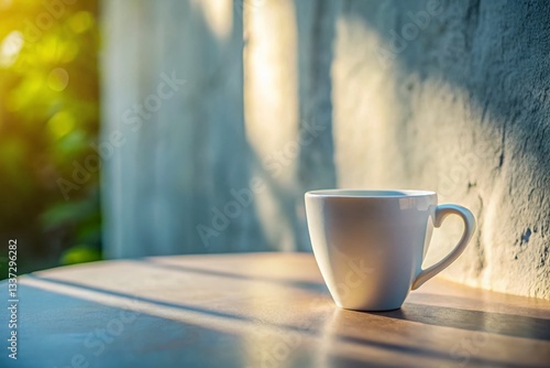 © Man888, Fototapeta premium Summer Morning Coffee: White Cup on Light Gray Wall Panoramic
