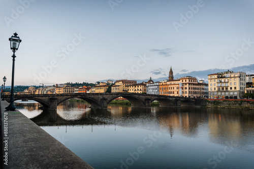 © Andrii Marushchynets, Fototapeta premium Summer morning in Florence. Ponto Vecchio and the historic center. People go jogging at dawn and there are no tourists.