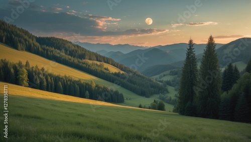 Fototapeta premium Summer Mountain Landscape Featuring Meadow, Spruce Forest, Sun and Moon in...