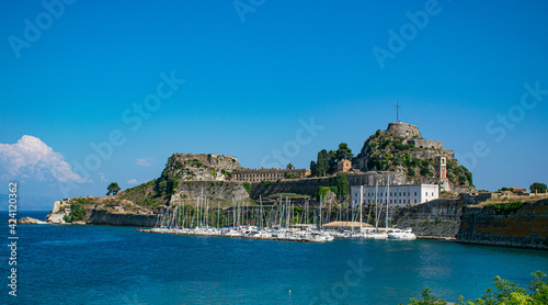 © Kufotos, Naklejka premium Summer panoramic seascape. View of the old fortress of Corfu with yachts. The Ionian Archipelago. Greece
