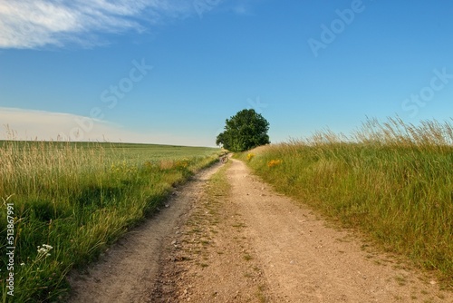 © Edita, Naklejka premium Summer panoramic view of czech (Souht Bohemia) landscape with fields, hills, meadow and path during sunset and mist, noise