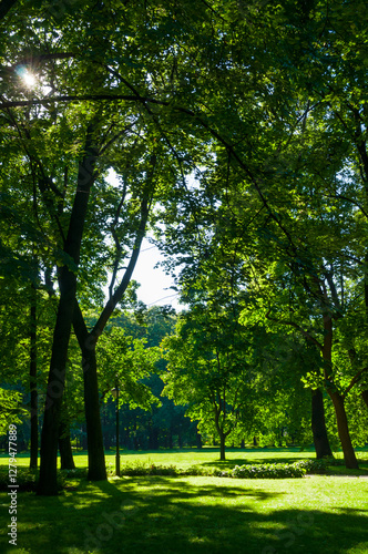 © syntheticmessiah, Fototapeta premium Summer park landscape, spreading summer trees in the park in summer sunny day