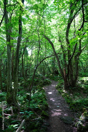 © SooHyun, Obraz premium summer path through mossy rocks and old trees