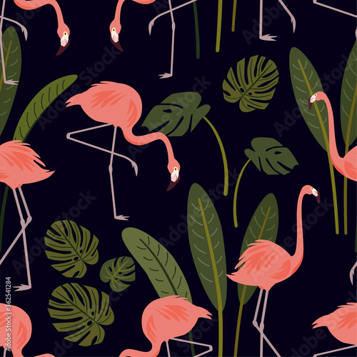 Obraz premium Summer pattern with exotic flamingo birds and tropical leaves. Vector seamless texture.