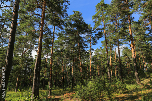 © Viktor Iden, Fototapeta premium Summer pine forest with blue sky in sunny day landscape