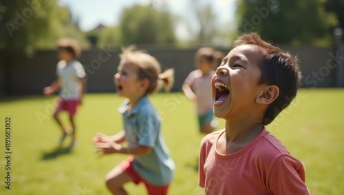 © PremiumPhoto, Fototapeta premium Summer Playground. Happy children playing outdoor sunny day
