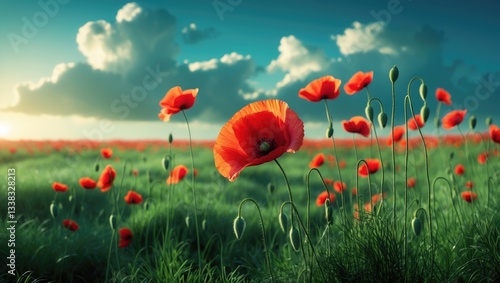 © Seyyar, Obraz premium Summer red poppy in a grassy field landscape.