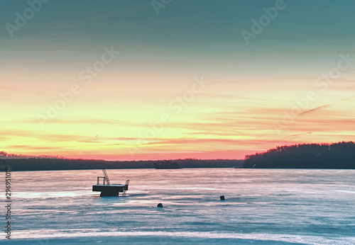 Naklejka premium Summer resort under ice within long winter. Breathtaking sunset