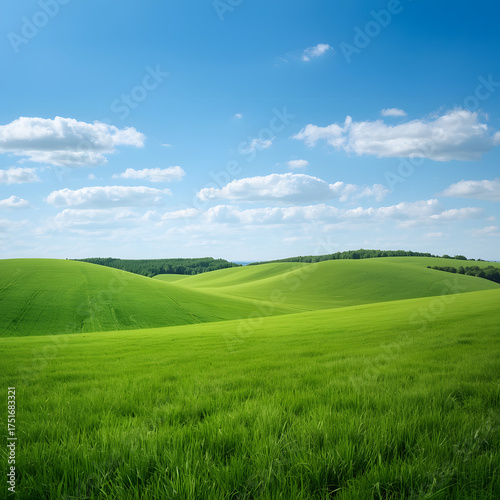 © shakibul, Fototapeta premium Summer Rolling Green Field Landscape Under a Blue Sky with Clouds