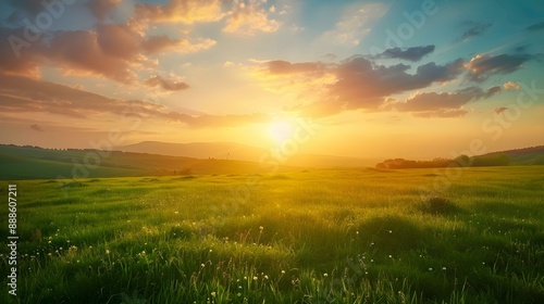 © Andrew, Obraz premium Summer rural landscape with green field and sunset sky