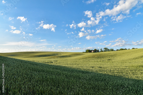 Naklejka premium Summer rural landscape with green wheat fields and hills at sunset. Selective focus. Wide angle view,