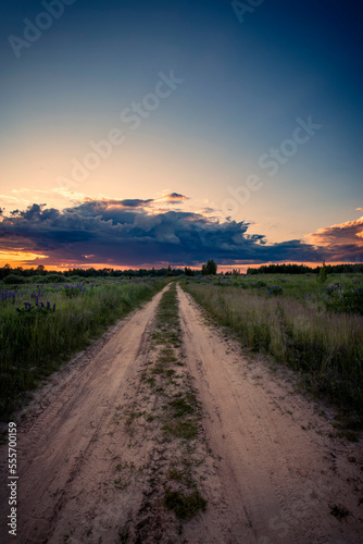 Fototapeta premium Summer rural landscape with road at evening time. Green field against blue...