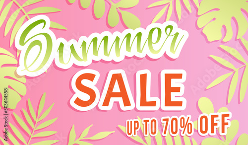 © Liliia, Obraz premium Summer Sale Banner. Palm tree leaves on pink background.
