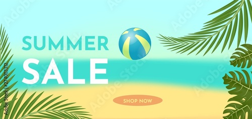 © olly2polly, Naklejka premium Summer sale banner template with tropic leaves. Hot offer concept. Vector illustration.