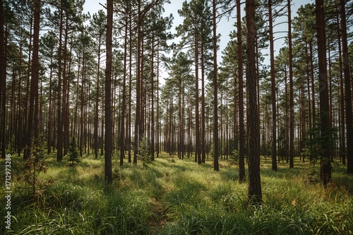 © vxnaghiyev, Fototapeta premium Summer scene of a charred woodland with green grass and natural surroundings