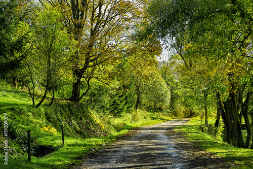 © alekosa, Naklejka premium Summer scene with road. Road in summer mountains. Beskid Mountai