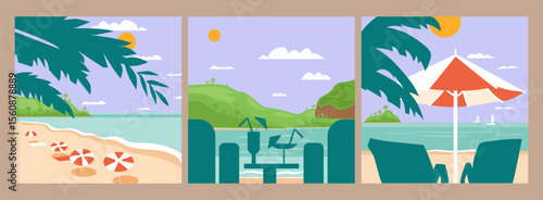 Fototapeta premium Summer sea beach landscape poster, cover, card set with sea view, sunny beach, palms and beach chairs. Summer vacation travel illustrations collection.