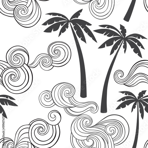 Fototapeta premium Summer seamless pattern with tropical palm and waves . Monochrome vector illustration on a white background.