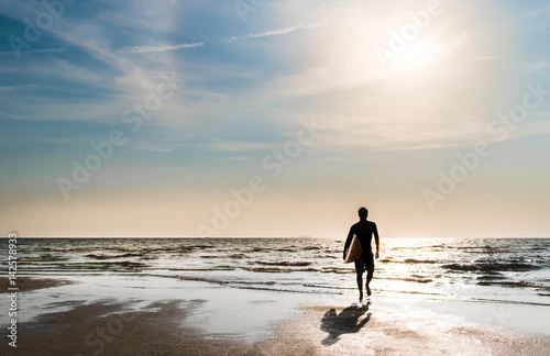 © pattarawat, Naklejka premium Summer Silhouette of Man on the beach at sunset