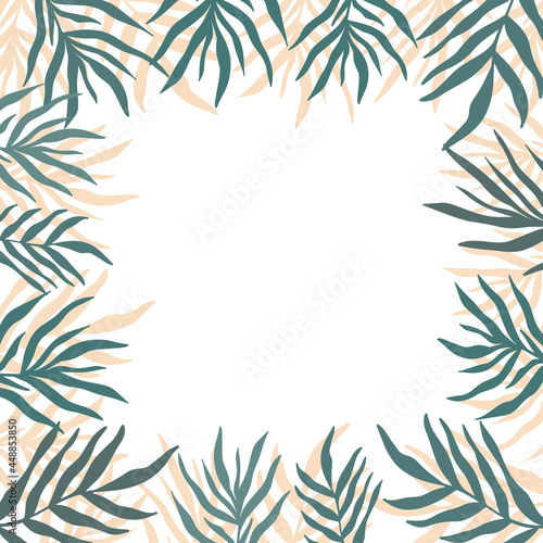 © Caelestiss, Fototapeta premium Summer square frame with elegant palm leaves teal foliage silhouette. Seasonal vacation design. Hand drawn abstract vector palm floral background border isolated on white. Copy space.