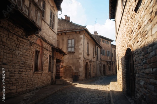 © AkuAku, Fototapeta premium Summer stroll through a historic narrow alley with old buildings and windows