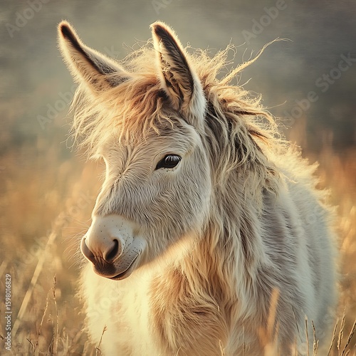 Fototapeta premium Summer sunlight shining on fluffy donkey high resolution picture