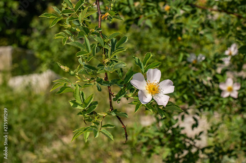 Fototapeta premium summer, Sunny, day, nature, flora, thin, branch, green, foliage, one, flower, rose hip, walk, observation