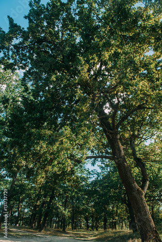 © dashamuller, Obraz premium Summer Sunny Forest Trees And Green Grass. Nature Wood Sunlight Background.