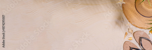 © ricka_kinamoto, Obraz premium Summer sunny sand background with straw hat