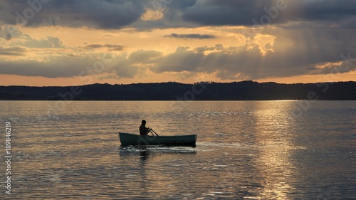 © u.perreten, Naklejka premium Summer sunset in Ebeltoft, Denmark. Man rowing in a small boat.