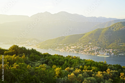Naklejka premium Summer sunset in the municipality of Herceg Novi: view of the mountains, sea, forest and coastal settlements painted in golden rays of the sun. Evening landscape from the Bay of Kotor, Montenegro.