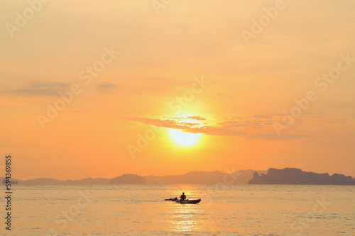 © grooveriderz, Naklejka premium Summer sunset view on the beach. Beautiful blazing sunset landscape