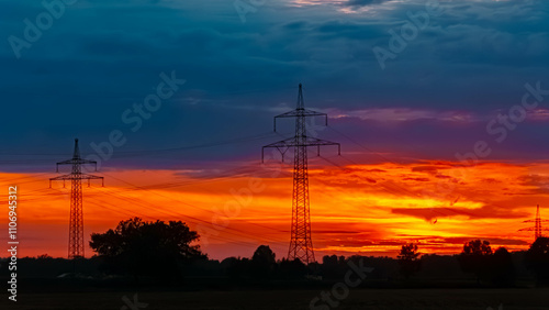 © Martin Erdniss, Fototapeta premium Summer sunset with a dramatic sky and overland high voltage lines near Tabertshausen, Deggendorf, Bavaria, Germany