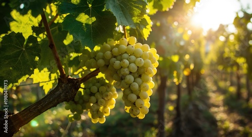 © vxnaghiyev, Fototapeta premium Summer sunshine illuminating juicy white grapes in vineyard garden