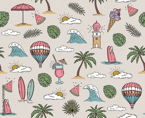 © oldesign, Naklejka premium Summer, Surfboard, wave, balloon, lighthouse, palm trees, leaves, monstera, hand drawn illustration, vector.