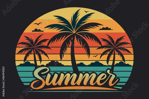 © Trendy CraftSVG , Naklejka premium Summer t-shirt design. Retro and vintage summer vibes t-shirt design with palm tree, sea beach, and sunset vector illustration